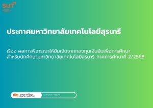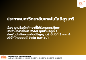 ประกาศมหาวิทยาลัยเทคโนโลยีสุรนารี เรื่อง รายชื่อนักศึกษาที่ได้รับทุนการศึกษา ประจำปีการศึกษา 2568 ทุนประเภทที่ 1 สำหรับนักศึกษาระดับปริญญาตรี ชั้นปีที่ 3 และ 4 บริษัท ไทยออยล์ จำกัด (มหาชน)